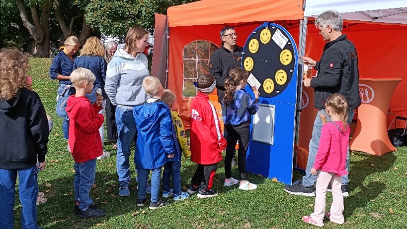 Besonders begehrt war unser Glücksrad; jeder – ob groß oder klein – wollte mal „am Rad drehen“. Jedes „Drehen am Rad“ wurde positiv bestärkt: Stand ein Smilie oben, gab es einen Schokoriegel oder eine Schachtel mit Kaugummi. Stand die Tafelkarte „Du hast Glück“ oben, hatte man die Auswahl unter lustigen Stempeln, Geschicklichkeits- und Kartenspielen, Stiften, Tattoo-Abziehbildchen und vielem mehr.