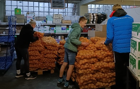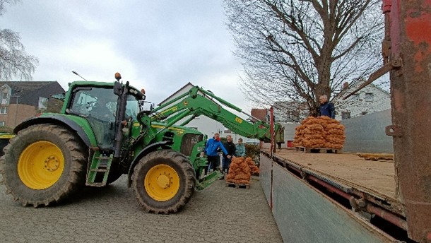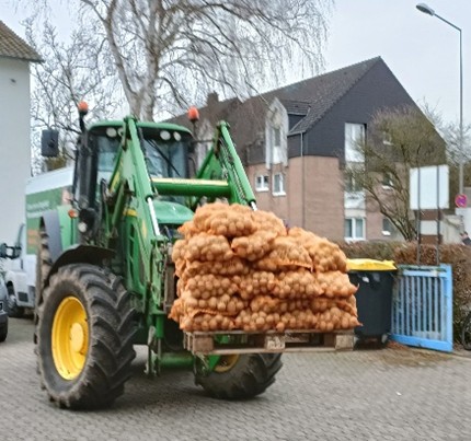 Am 22.12.2025 fährt ein Traktor mit riesigem Anhänger auf den Hof der Mindener Tafel, befüllt mit 4,5 Tonnen Speisekartoffeln in handlichen Portionssäcken auf Paletten gelagert. Es handelt sich hierbei um eine Spende der Familien Plenge und Inderfurth. Familie Plenge unterstützt persönlich die Einlagerung der Kartoffeln im Keller der Tafel.