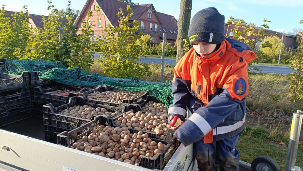 In der Zwischenzeit war die Jugendfeuerwehr Leeseringen mit Jugendwartin Karen Focke-Hecht auf den Höfen Arkenberg und Reese unterwegs, um Kartoffeln und Möhren zu stoppeln. Die Kinder und Jugendlichen waren so engagiert, flink und mit Freude bei der Sache, dass sich auch hier die Kisten stapelten.