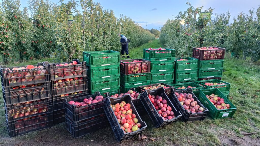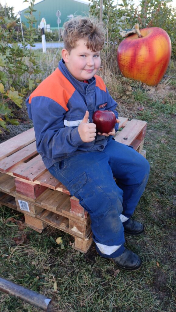 Ein riesiges Feld mit vielen Reihen an Apfelbäumen, vollbehangen mit Sorten wie Rubinette, Elstar, Jonagold, Braeburn und weiteren mehr, lag vor uns. Für uns war Stoppeln angesagt, das heißt, nur die großen, roten und leckeren Äpfel – Reihe um Reihe unter den Bäumen – wurden in zahlreiche Kisten gesammelt. Lecker und zum Reinbeißen, da durfte auch das Naschen zwischendurch nicht zu kurz kommen. Mit fleißigen Helferinnen und Helfern der Tafel, aus dem Freundeskreis und mit Familienmitgliedern des Roundtable füllten sich die Kisten und der Stapel an Kisten wuchs.